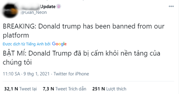 11/01/2021 03:30Không chỉ Facebook, Donald Trump vừa bị khoá tài khoản vĩnh viễn trên hàng loạt mạng xã hội lớn