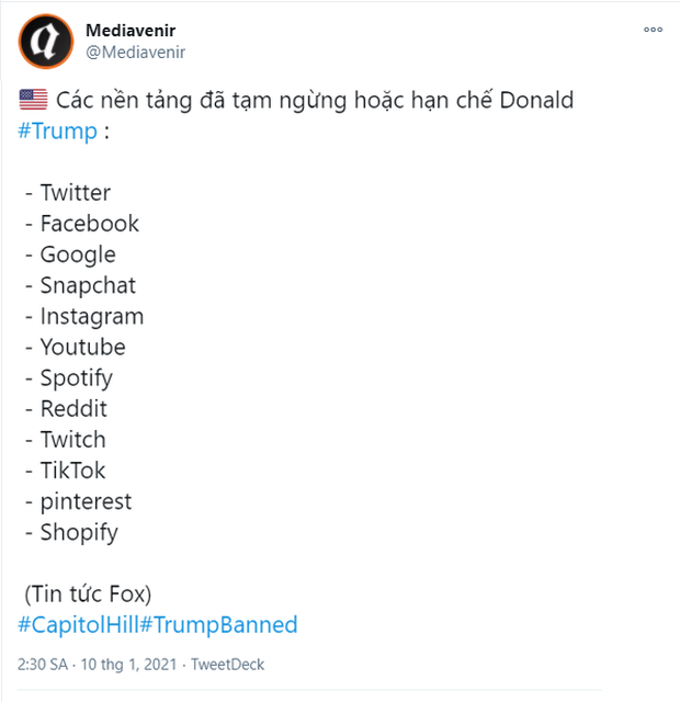 Hãy nhìn vào hình ảnh bên dưới, từ những nền tảng Google, Facebook, Twitter... cho đến ứng dụng TikTok bị Trump quyết "ban" cho bằng được cũng đồng loạt khóa tài khoản của ông.