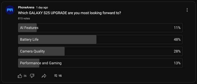 Trang Phone Arena đã thực hiện một khảo sát trên cộng đồng YouTube về nâng cấp thú vị nhất mà họ mong muốn được thấy ở dòng S25.