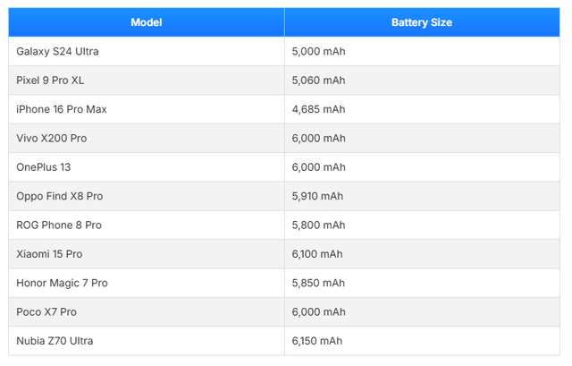 Nhìn vào bảng liệt kê dưới đây, chiếc điện thoại Android cao cấp duy nhất có dung lượng pin tương tự Galaxy S25 Ultra là Pixel 9 Pro XL. Tất cả các điện thoại khác đều tăng lên dung lượng khoảng 6.000 mAh, lớn hơn gần 20%. Nubia Z70 Ultra thậm chí có dung lượng lên đến 6.150 mAh, tăng 23% so với Galaxy.
