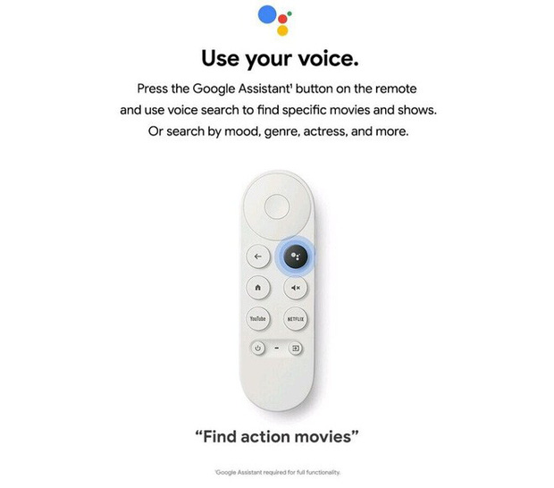 Chiếc remote của Chromecast mới có thiết kế tương đối đơn giản với nút điều hướng để thao tác trên giao diện của Google TV, nút back/ home và 2 nút chuyên biệt cho YouTube và Netflix. Đặc biệt, nó còn được tích hợp micro và người dùng có thể ra lệnh bằng giọng nói với trợ lý ảo Google Assistant.