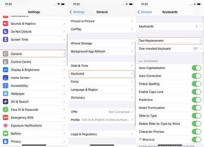 Đó chính là tính năng tạo các từ hoặc câu đơn bằng những ký tự viết tắt, trong iOS 14. Bạn có thể thiết lập tính năng này bằng cách vào Settings > General > Keyboard > Text Replacement. Sau đó bấm vào dấu cộng để thêm các câu mới, hoặc bấm vào các câu có sẵn để chỉnh sửa.