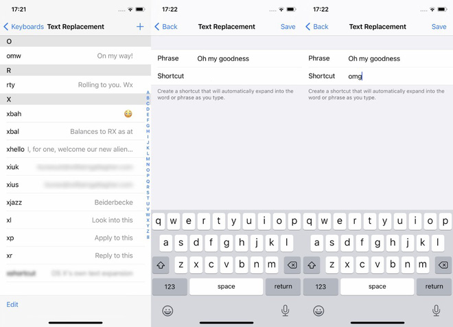 Khi mới thiết lập, bạn có thể thấy một số câu có sẵn như “omw” có nghĩa là “On my way!”. Nó có nghĩa là trong bất kỳ ứng dụng nào trên iOS, bạn chỉ cần gõ 3 ký tự “omw”, bàn phím của iOS sẽ tự động biến thành cụm từ “On my way”, bạn có thể bấm gửi luôn hoặc bấm dấu cách để tiếp tục viết thêm.