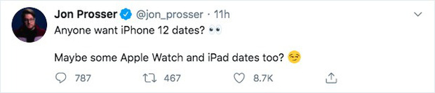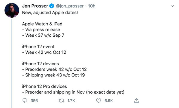 Gần đây, leaker nổi tiếng chuyên tiết lộ thông tin của nhà Táo - Jon Prosser đã đăng trên Twitter của mình rằng "Mọi người có muốn biết ngày iPhone 12 ra mắt không nào? Có lẽ sẽ thêm cả ngày ra mắt của Apple Watch và iPad nữa". Dòng tweet này đã nhận về gần 9.000 tim.