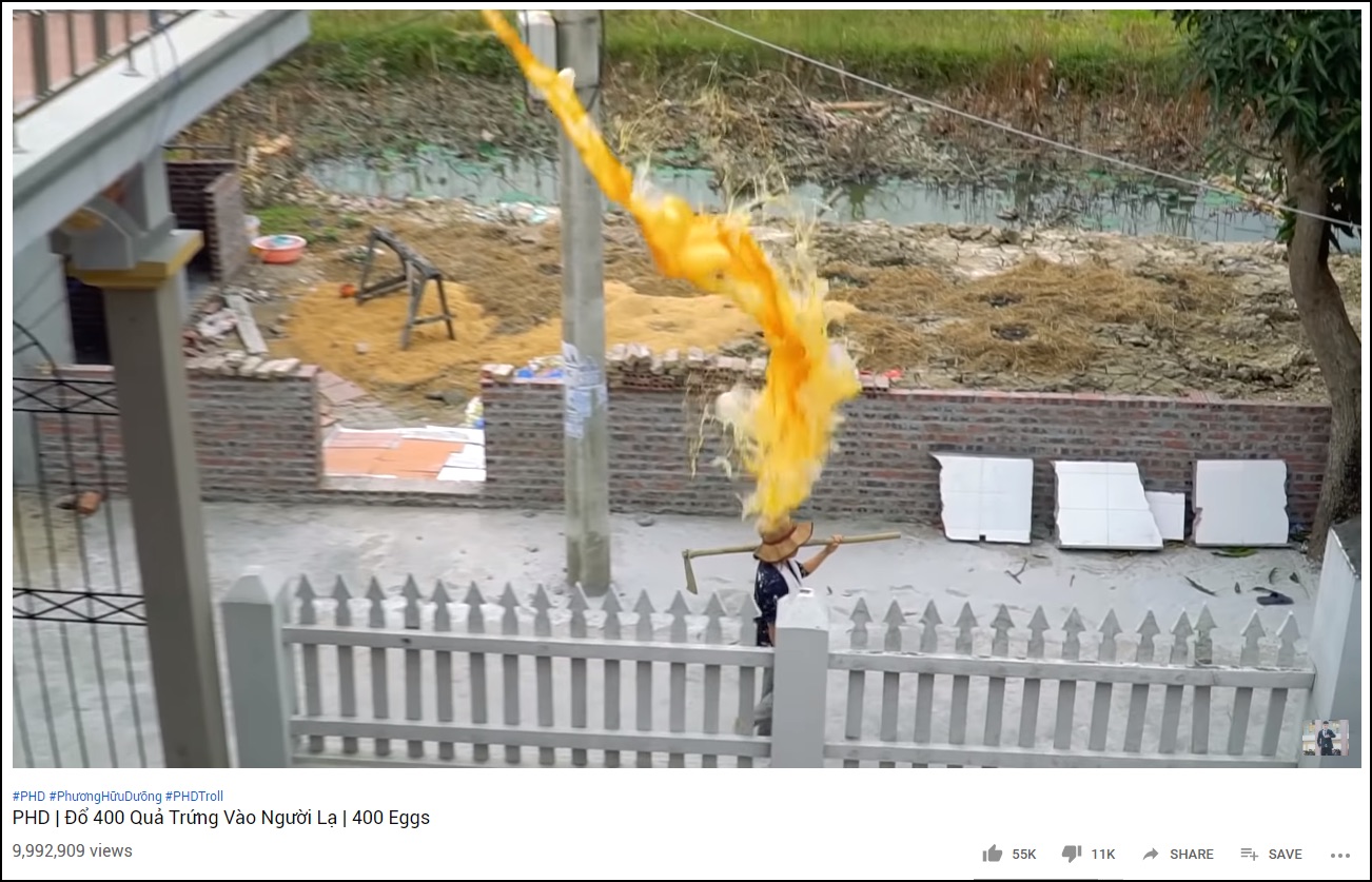 Cụ thể, kênh YouTube PHD Troll là nguồn gốc của 2 video đang bị lần tìm dù đã đăng được khá lâu, đều có nội dung dùng hàng loạt trứng sống chất vào ngập chậu rồi đổ xuống để chơi khăm người khác. Một trong số đó còn là dụng ý cố tình đổ trứng vào người lạ, càng khiến cư dân mạng bất bình khôn nguôi, kể cả khi nó đã xảy ra từ lâu, trước cả thanh niên đổ trứng vào mẹ.