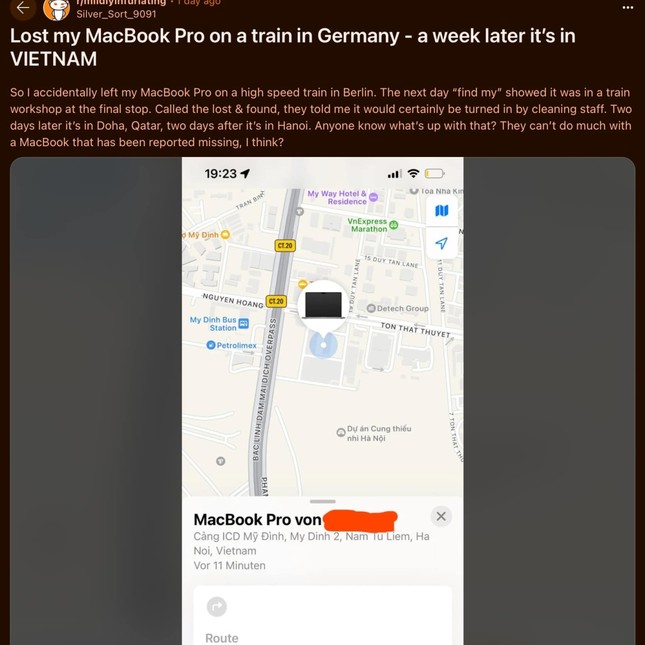 Chưa hết ngạc nhiên, ngày hôm sau, anh lại nhận được thông báo rằng chiếc laptop của mình hiện đã có mặt tại Hà Nội, Việt Nam. Sự di chuyển nhanh chóng và kỳ lạ của chiếc MacBook không chỉ gây bất ngờ mà còn khiến chủ nhân hoang mang khi theo dõi hành trình “phiêu lưu” của thiết bị.