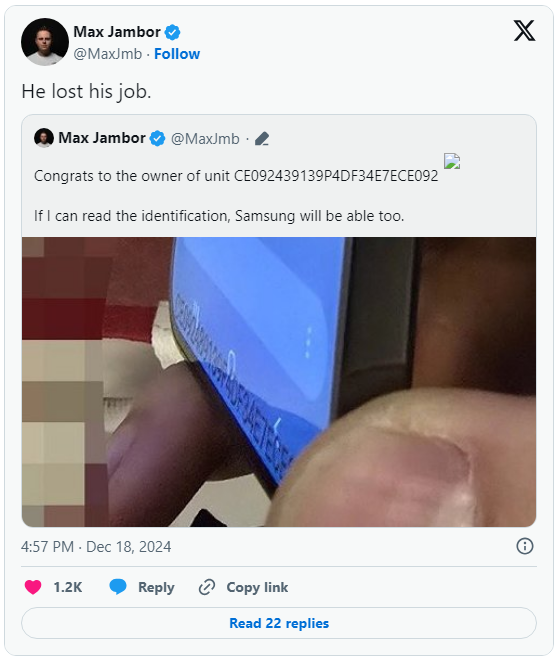 Mới đây, những hình ảnh trên tay Galaxy S25 Plus bị rò rỉ đã dẫn đến việc một nhân viên của Samsung bị sa thải. Những người làm rò rỉ hình ảnh đã không xóa số nhận dạng thiết bị hiển thị trên chiếc Galaxy S25 bị rò rỉ, cho phép Samsung truy ra và chấm dứt hợp đồng lao động với họ. Đây không phải lần đầu tiên Samsung sa thải nhân viên vì rò rỉ thông tin, nhưng bất chấp những nỗ lực tốt nhất để giữ bí mật, không có cách nào ngăn cản được nhiều thông tin rò rỉ hơn về dòng Galaxy S25.