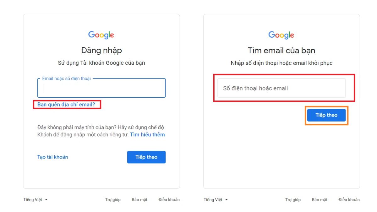 Bước 1: Truy cập vào trang Gmail.com bằng trình duyệt web. Tại trang đăng nhập tài khoản Gmail, chọn mục "Bạn quên địa chỉ email?" Sau đó bạn nhập số điện thoại của bạn vào ô "Số điện thoại hoặc email". Tiếp tục nhấn Tiếp theo để thực hiện cách lấy lại mật khẩu Gmail bằng số điện thoại theo hướng dẫn.