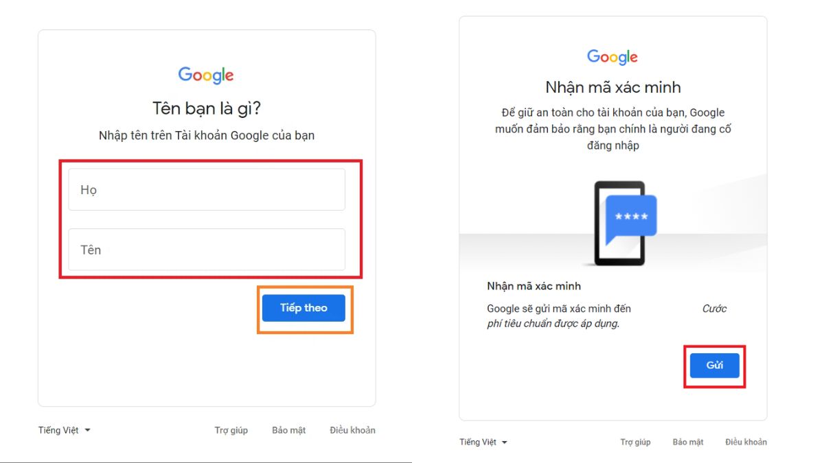Bước 2: Tiến hành nhập họ và tên của bạn trên tài khoản Google và nhấn Tiếp theo. Sau đó bạn sẽ nhận được mã xác minh từ Google. Hãy nhấn Gửi để nhận mã xác minh.