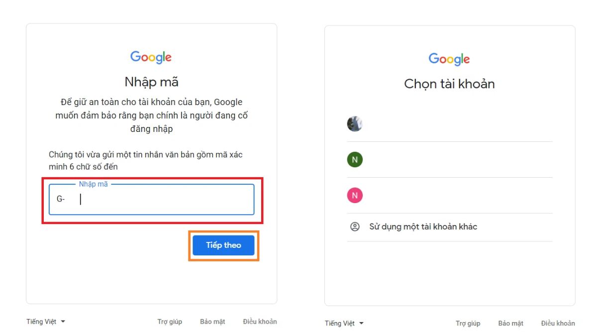 Bước 3: Nhập mã xác minh 6 chữ số được gửi đến số điện thoại của bạn. Sau đó, nhấn Tiếp theo để tiếp tục cách lấy lại mật khẩu Gmail bằng số điện thoại. Sau khi nhập mã xác minh, Google sẽ liệt kê những tài khoản liên kết với số điện thoại bạn cung cấp. Cuối cùng, bạn chỉ cần chọn tài khoản mà bạn muốn và đăng nhập vào Gmail đã xong.