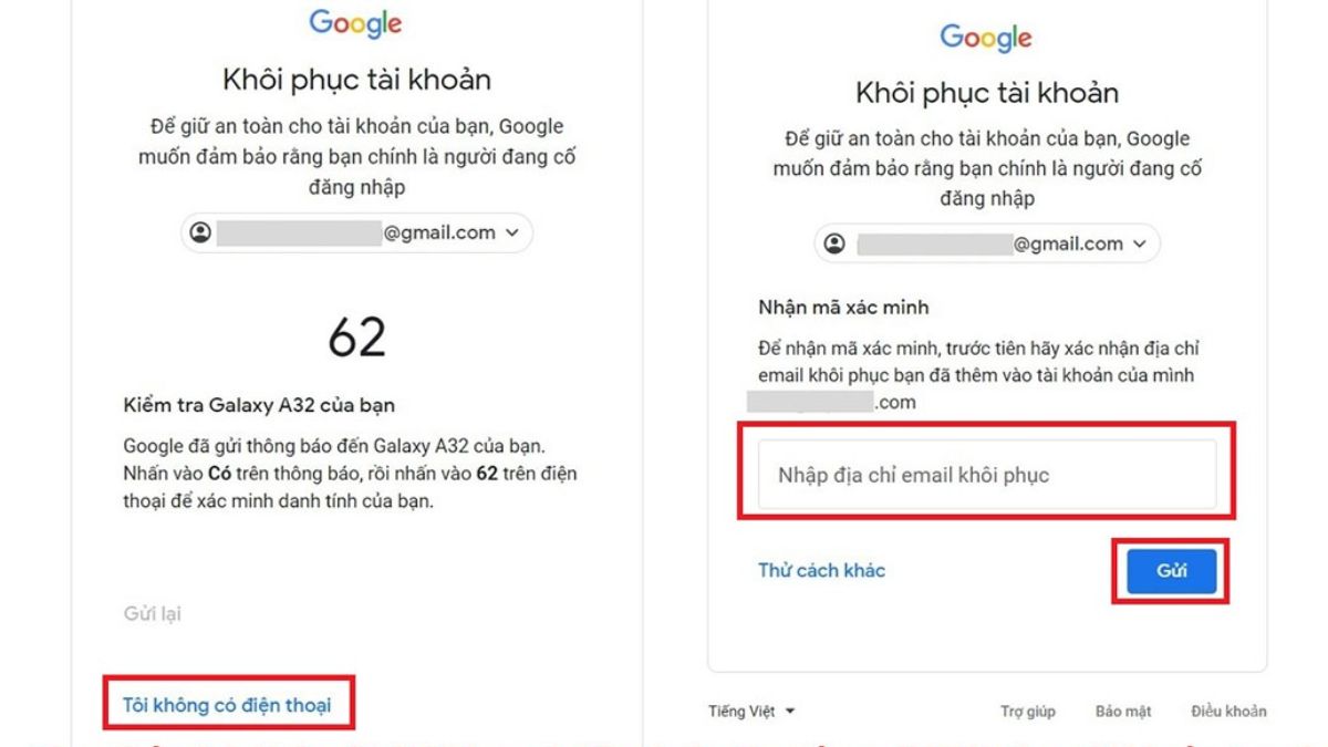 Bước 3: Tiếp theo, chọn "Thử cách khác". Hệ thống vẫn sẽ yêu cầu bạn nhập số điện thoại để nhận mã xác minh. Nếu bạn đã quên hoặc mất số điện thoại đã đăng ký tài khoản. Hãy chọn "Tôi không có điện thoại". Sau đó, nhập địa chỉ email khôi phục và nhấn Gửi. Hệ thống sẽ gửi mã xác minh vào email khôi phục.