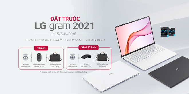 Từ ngày 15/05 đến hết ngày 30/06/2021, LG Việt Nam tung ra chương trình ưu đãi khi đặt hàng Gram 2021. Khách hàng sẽ nhận được bộ quà tặng gồm tai nghe LG tone FN6, chuột Microsoft Arc, túi đựng laptop phiên bản giới hạn logo LG gram (dành cho phiên bản 16" và 17") hoặc tai nghe LG tone FN4, chuột Logitech M350, túi đựng laptop phiên bản giới hạn logo LG gram (dành cho phiên bản 14").