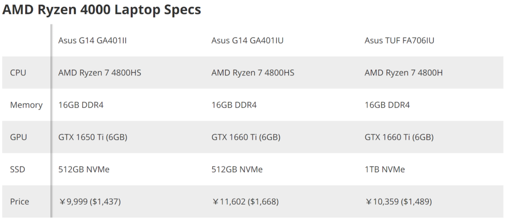 Những mẫu laptop này là Asus ROG Zephyrus G14 GA401II, ROG Zephyrus G14 GA401IU, và TUF FA706IU. 2 mẫu Zephyrus thì được trang bị AMD Ryzen 7 4800HS, còn mẫu TUF thì sử dụng AMD Ryzen 7 4800H.