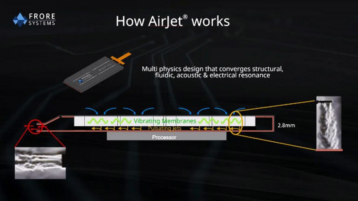 Thiết bị làm mát AirJet là 1 mô đun hình chữ nhật có kích thước chỉ bằng 1/2 thanh RAM sẽ được đặt phía trên bộ xử lý để làm mát thay quạt gió. Thế hệ đầu tiên của AirJet được thiết kế để làm mát laptop, máy tính bảng và máy chơi game di động.
