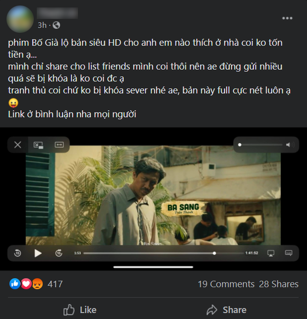 Với vài dòng chia sẻ ngắn gọn: "Phim Bố Già lộ bản siêu HD cho anh em nào thích ở nhà coi ko tốn tiền ạ... Mình chỉ share cho list friend mình coi thôi nên anh em đừng gửi nhiều quá sẽ bị khóa là không coi được ạ. Tranh thủ coi chứ ko bị khóa sever nhé ae, bản này full cực nét luôn ạ. Link ở bình luận nha mọi người" - Tài khoản Facebook Thanh Lê chia sẻ.