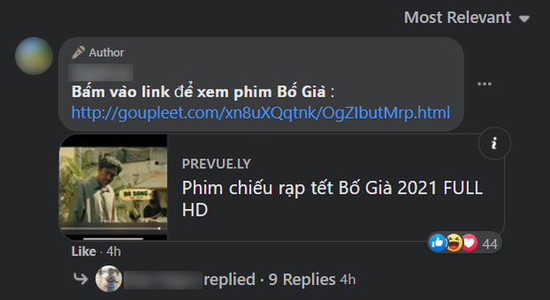 Đúng như chia sẻ, bên dưới bài đăng của người dùng này chứa một đường dẫn với tiêu đề "Phim chiếu rạp tết Bố Già 2021 FULL HD" và hình ảnh thumbnail cũng khớp với bộ phim kể trên, khá thuyết phục.