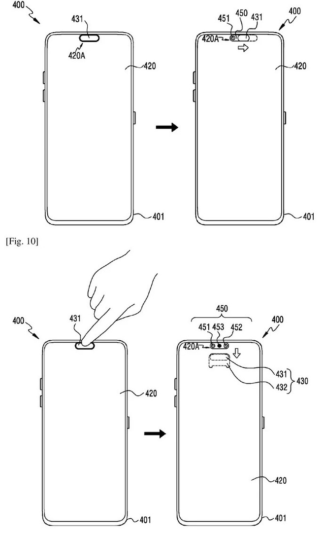 Bằng sáng chế mô tả một màn hình phụ kích thước nhỏ, trang bị động cơ và nằm bên dưới màn hình chính, đồng thời ở phía trước cụm camera selfie. Bất cứ khi nào người dùng cần sử dụng camera trước, màn hình phụ sẽ hạ xuống để ánh sáng đi vào cảm biến. Khi không dùng đến camera trước, màn hình phụ sẽ che đi cảm biến và đảm bảo chất lượng hình ảnh cho màn hình.