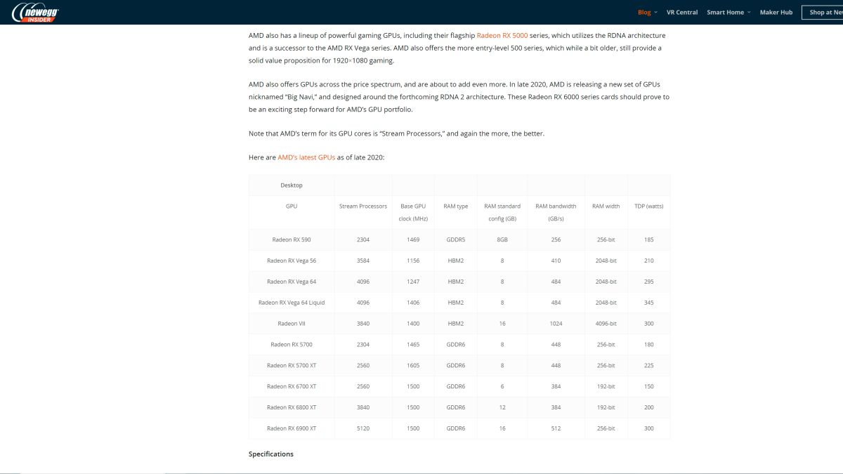 Theo Newegg thì Radeon RX 6900 XT sẽ có 5120 SPs cùng với 16 GB VRAM GDDR6 (256-bit) và băng thông 512 GBps. Còn Radeon RX 6800 XT thì có 3840 SPs và được trang bị 12 GB VRAM GDDR6 (192-bit) giúp đạt băng thông tối đa là 384 GBps.