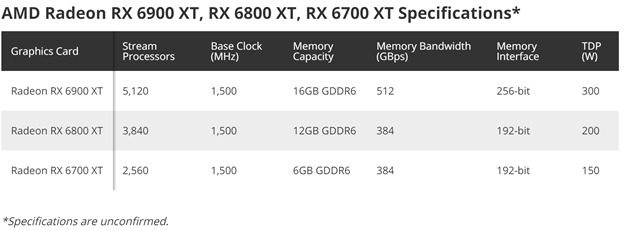 Cuối cùng, Radeon RX 6700 XT có 2560 SPs và 6 GB VRAM GDDR6, băng thông thì giống với RX 6800 XT. Về mức TDP của Radeon RX 6900 XT, RX 6800 XT, và RX 6700 XT thì lần lượt sẽ là 300W, 200W, và 150W.