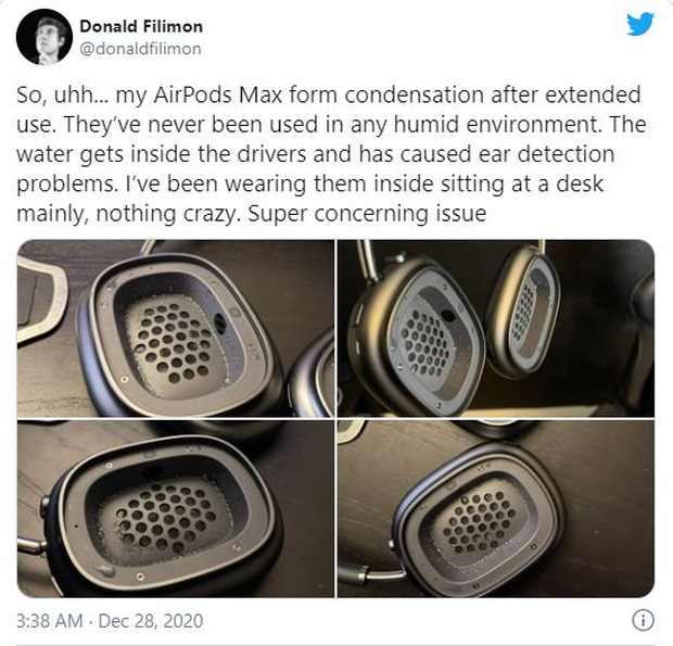 Apple bắt đầu bán AirPods Max vào ngày 15/12 năm ngoái. Một số YouTuber sau khi nhận được chiếc tai nghe vài giờ đã đăng trên Twitter về việc nhận ra sự tích tụ hơi nước bên trong tai nghe của mình. Ban đầu, hiện tượng này chỉ được ghi nhận sau khi người dùng sử dụng tai nghe trong thời gian dài liên tục.