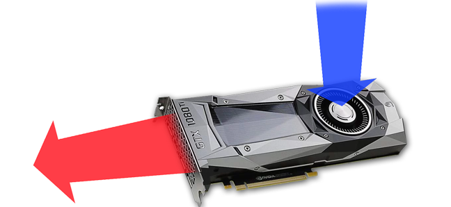 Đối với card màn hình dùng tản “bếp ga”, những cánh quạt sẽ hút khí từ bên trên rồi thổi thẳng vào các lá heatsink. Sau đó, dòng khí nóng sẽ đi theo các khe tản nhiệt và xả ra hai bên. Khi đó, khí nóng có thể thổi trúng vào các thành phần bên trong của PC. Các bạn có thể xem hình bên dưới để dễ hiểu hơn, trong đó, mũi tên màu xanh là dòng khí mát, còn mũi tên đỏ là dòng khi nóng xả ra.