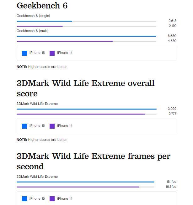 Bộ xử lý A16 Bionic cho trải nghiệm nhanh và linh hoạt đúng như người dùng mong đợi. Chiếc iPhone này đã được chạy kiểm tra hiệu năng benchmark trên Geekbench 6 và 3DMark Wild Life Extreme – kiểm tra về đồ hoạ. iPhone 15 đạt điểm cao hơn iPhone 14 trong cả hai bài kiểm tra.