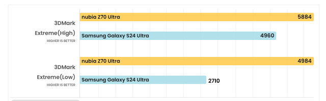 Nubia Z70 Ultra không chỉ vượt trội hơn Galaxy S24 Ultra về điểm hiệu năng "đỉnh" khi chơi game mà còn tốt hơn cả về điểm hiệu năng "thấp". "Thấp" là điểm bạn nhận được sau 20 phút chơi game, hay nói cách khác là sau khi điện thoại nóng lên và bắt đầu chậm lại. Nói đơn giản, điểm "thấp" chính là hiệu suất "thực" của điện thoại trong điều kiện chơi liên tục.