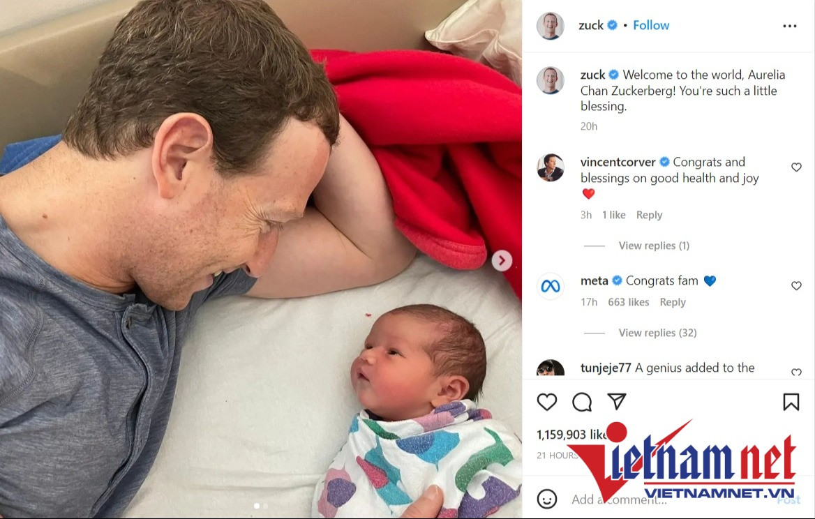 Ngày 24/3, Zuckerberg thông báo vợ của ông vừa sinh con thứ ba. Tên của cô bé là Aurelia. Ông cũng chia sẻ hình ảnh của em bé trên Instagram và gọi cô bé là “phước lành bé nhỏ”. Bức ảnh nhận được hơn 1 triệu lượt thích sau 20 giờ đăng tải.