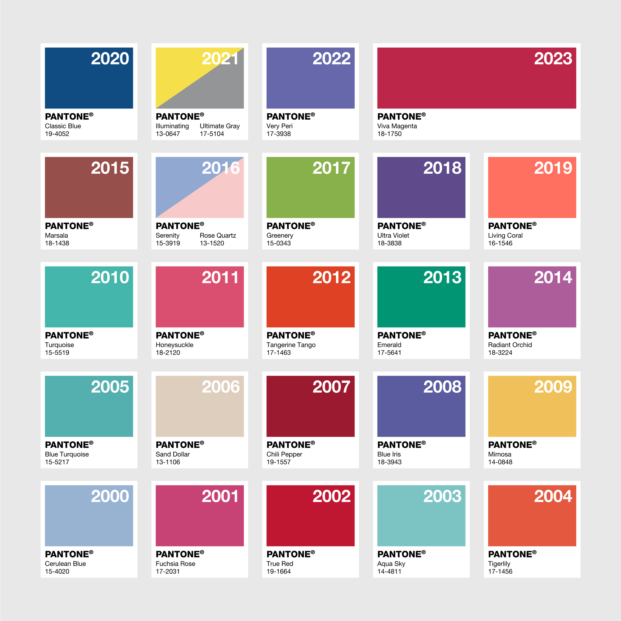 Màu sắc của năm được Pantone lựa chọn vào tháng 12 hàng năm, lần đầu tiên là màu Xanh da trời vào năm 1999. Màu của năm 2024 là màu 13-1023 Peach Fuzz.