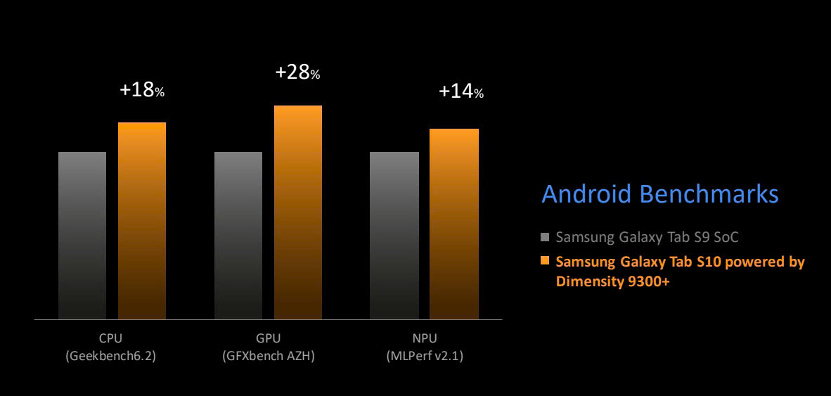 Nhờ sự giúp sức của vi xử lý mới, Galaxy Tab S10 Ultra sở hữu CPU tăng 18%, GPU tăng 28% và NPU tăng 14% so với Galaxy Tab S9 Ultra. Cải tiến về phần cứng góp phần mang đến cho người dùng trải nghiệm mượt mà, không giật lag khi sử dụng Galaxy Tab S10 Ultra và Galaxy Tab S10+, đặc biệt là các tác vụ nặng. Việc thay đổi vi xử lý trên dòng máy tính bảng cao cấp của mình cũng cho thấy tham vọng xây dựng trải nghiệm tối ưu cho người dùng của Samsung, đặc biệt là trong kỷ nguyên AI.