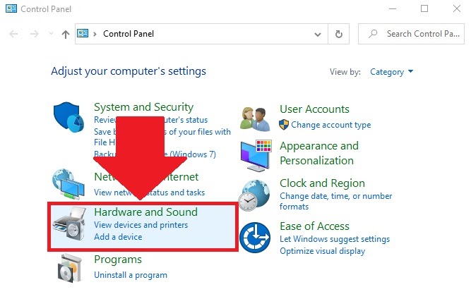 Bước 2: Khi cửa sổ Control Panel hiện lên, bạn chọn Hardware and Sound.