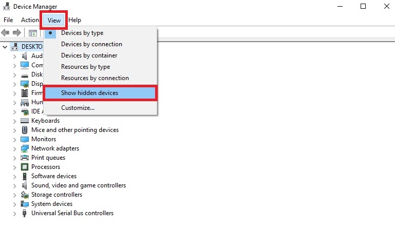 Bước 4: Sau đó bạn chọn mục View rồi chọn Show hidden devices.