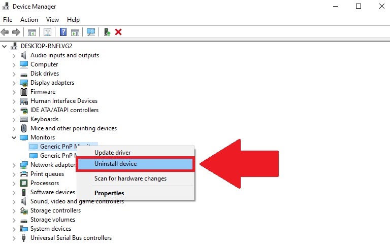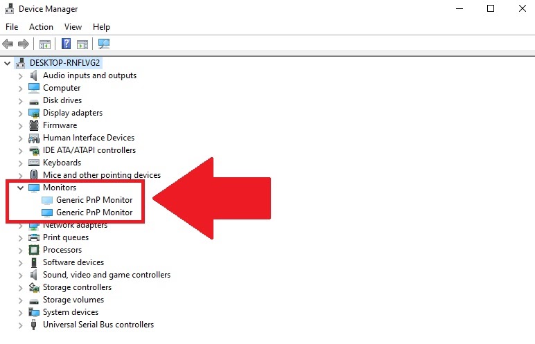 Bước 5: Bây giờ, bạn tìm và chọn mục Monitors, bạn sẽ thấy bên dưới hiện ra các màn hình được kết nối của máy tính, và nếu có màn hình nào bị mờ đi như hình ví dụ bên dưới thì tức là máy tính của bạn đang bị màn hình ma.