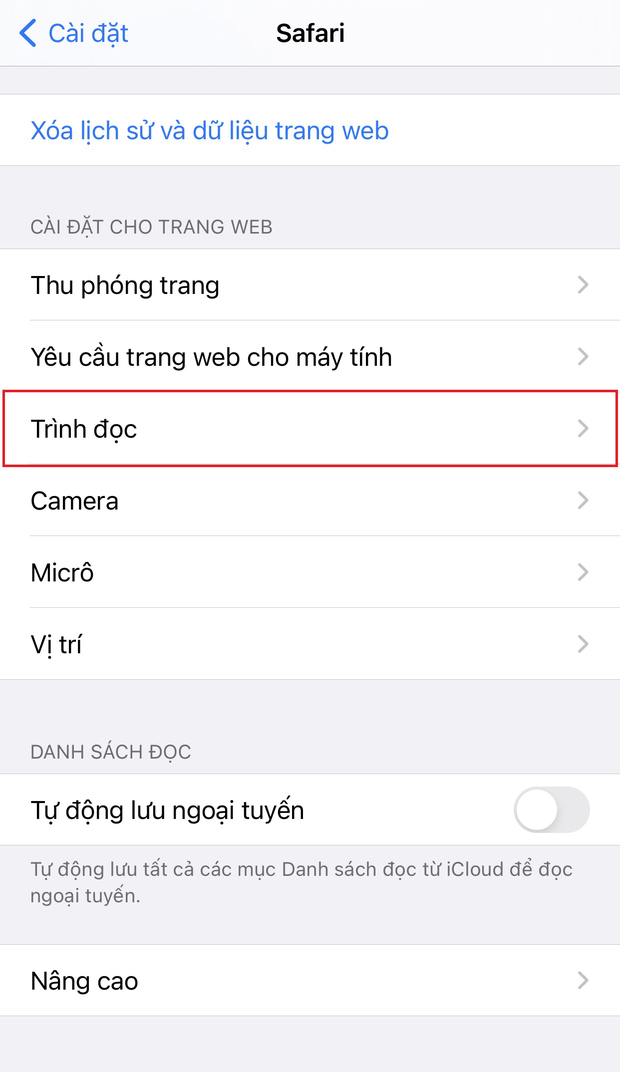 Sau khi đã vào phần thiết lập Safari, hãy kéo xuống và tìm mục Cài đặt cho trang web => Trình đọc.