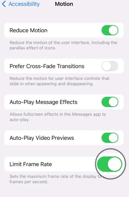 Bạn vào Cài Đặ> Trợ Nă> Chuyển Động và sau đó bật nút Giới hạn tốc độ khung hình. Điều này sẽ giúp giảm tốc độ khung hình trên iPhone của bạn giảm xuống còn 60Hz, qua đó tiết kiệm kha khá lượng pin sử dụng.