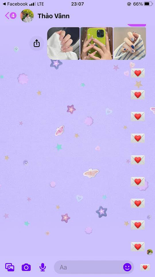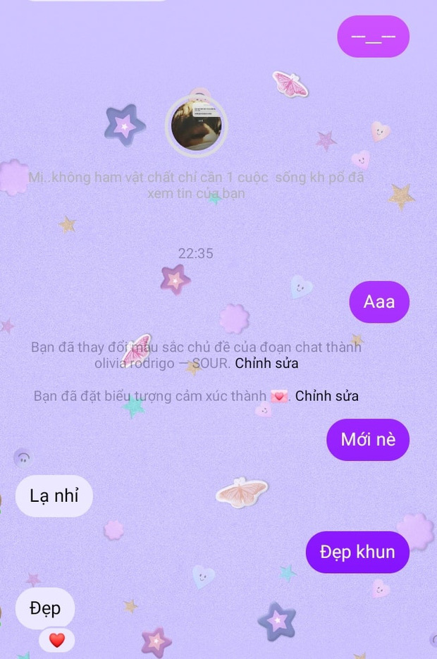 Hiện chủ đề Sour mới này đang được cộng đồng mạng khen dễ thương, siêu đáng yêu bởi màu tím mộng mơ, icon sẽ chuyển về phong bì thư và nền cuộc trò chuyện sẽ toàn hoa, sao, bướm...