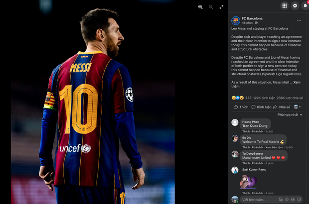 Rạng sáng ngày 6/8, mạng xã hội dường như bùng nổ trước thông tin chính thức được Barcelona đưa ra để thông báo về tương lai của Messi. Theo đó, siêu sao Messi sẽ chính thức rời Barcelona sau 21 năm gắn bó. Lý do được đội bóng này đưa ra chính là "vì trở ngại về mặt tài chính và cấu trúc". Ngay lập tức những thông tin này đã khiến người hâm mộ Messi, fan của đội bóng cùng người hâm mộ khắp thế giới bàng hoàng.