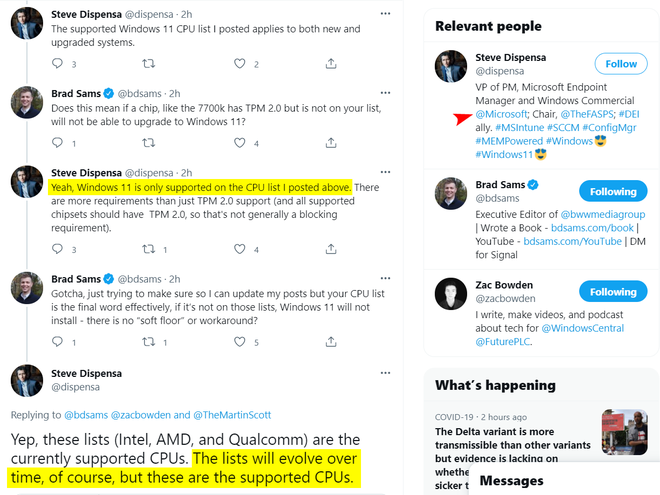 Theo danh sách từ Microsoft, chỉ những con chip Intel thế hệ thứ 8 trở lên, hoặc AMD Ryzen 2000 series trở lên, mới chính thức hỗ trợ Windows 11. Theo dòng Tweet của ông Steve Dispensa, một quan chức của Microsoft, "Windows 11 chỉ được hỗ trợ trên những dòng CPU có mặt trong danh sách". Mặc dù vậy, cũng theo Steve, "danh sách này có thể được điều chỉnh qua thời gian".