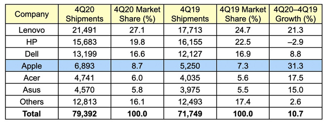 Thực tế, Microsoft hoàn toàn có lý do để lo ngại. Theo số liệu vừa được công bố bởi Gartner, trong Q4 2020, máy Mac của Apple đã đạt mức tăng trưởng tới 31.3% - một con số rất ấn tượng khi so sánh với các đối thủ.