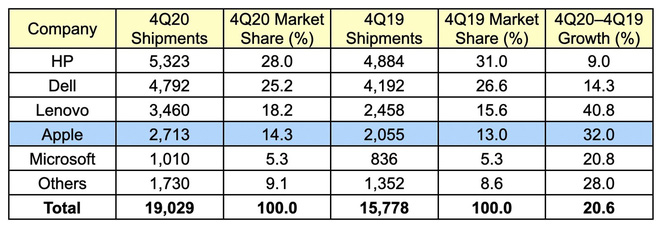 Riêng tại Mỹ, thị phần của Apple trong Q4 2020 đạt 14.3% và xếp thứ 4. Xếp ở vị trí ngay sau đó là Microsoft, tuy nhiên thị phần của nhà sản xuất Surface chỉ đạt mức 5.3%, bằng 1/3 so với Apple.