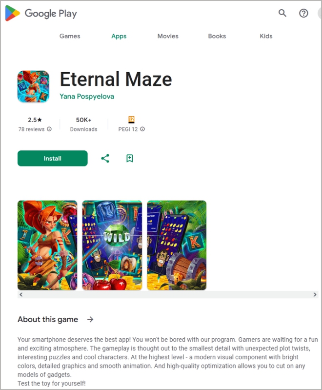 Trong các trường hợp khác, Dr. Web phát hiện các ứng dụng trò chơi tải các trang web sòng bạc trực tuyến đáng ngờ vi phạm chính sách của Google Play.