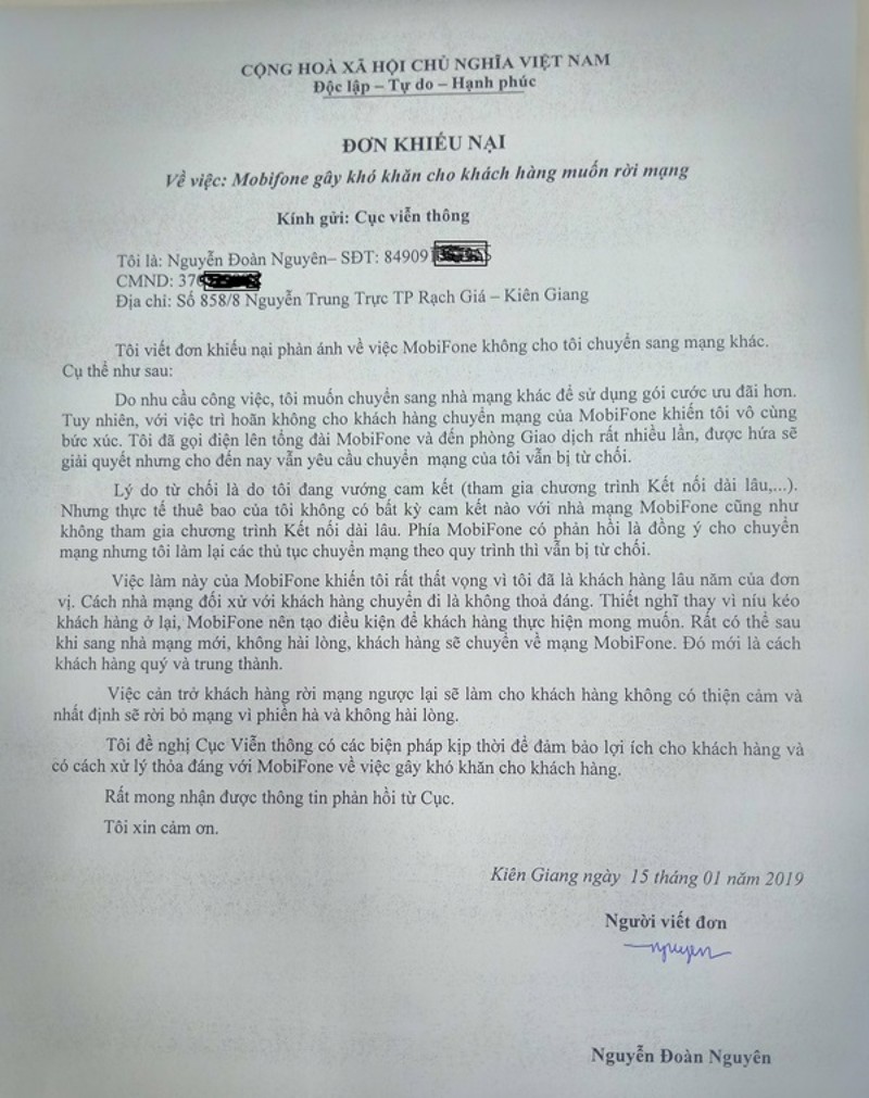 Tương tự, ông Nguyễn Trung Nghĩa ở phường Hạ Lý (quận Hồng Bàng, TP. Hải Phòng), chủ sở hữu số thuê bao 0906102xxx bức xúc, tôi có nhu cầu chuyển sang đơn vị cung cấp dịch vụ mới. Tuy nhiên, phía MobiFone lấy lý do vướng mắc một trong các điều kiện chuyển mạng để từ chối yêu cầu của tôi.