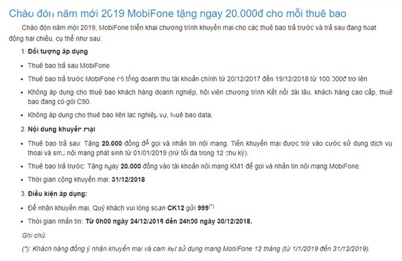 Theo đó, MobiFone đã tung ra một chương trình khuyến mãi: tặng 20.000 đồng cho mỗi thuê bao nhân dịp năm mới 2019. Tuy nhiên, nhà mạng này đã rất khéo léo cài điều kiện “Khách hàng đồng ý nhận khuyến mại và cam kết sử dụng mạng MobiFone 12 tháng (từ 1/1/2019 đến 31/12/2019)” xuống phía dưới cùng của thông báo, nơi nhiều người ít để ý.