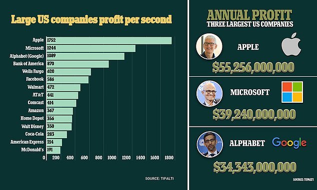 Microsoft và Alphabet, công ty mẹ Google, cũng mang về hơn 1.000 USD lợi nhuận mỗi giây, tương đương hơn 100 triệu USD/ngày. Đối với Microsoft, mảng điện toán đám mây, điện toán cá nhân và sản phẩm doanh nghiệp có đóng góp tương đương nhau. Trong khi đó, tại Alphabet, hơn 90% lợi nhuận đến từ quảng cáo.