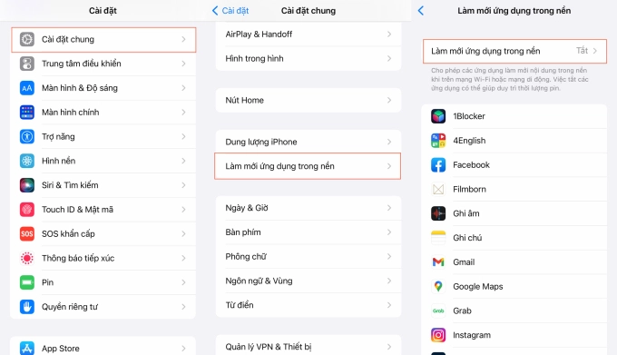 Người dùng có thể đi tới Cài đặt, nhấp vào Cài đặt Chung và tìm Làm mới ứng dụng trong nền. Sau đó, người dùng có thể lựa chọn tắt tính năng này riêng lẻ cho một số ứng dụng hoặc chung cho tất cả ứng dụng đang chạy nền dưới điện thoại.