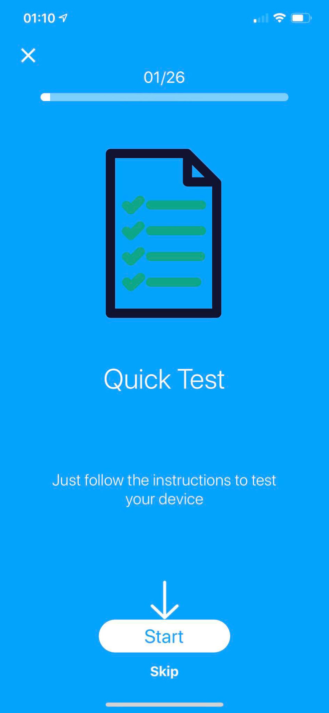 Sau khi đã tải ứng dụng về, bạn có thể đăng nhập bằng các tài khoản Apple/Facebook/Google có sẵn. Kế tiếp, ở giao diện các tùy chọn của ứng dụng hãy chọn vào Test your phone và thực hiện 26 bước mà ứng dụng yêu cầu để test máy của bạn.