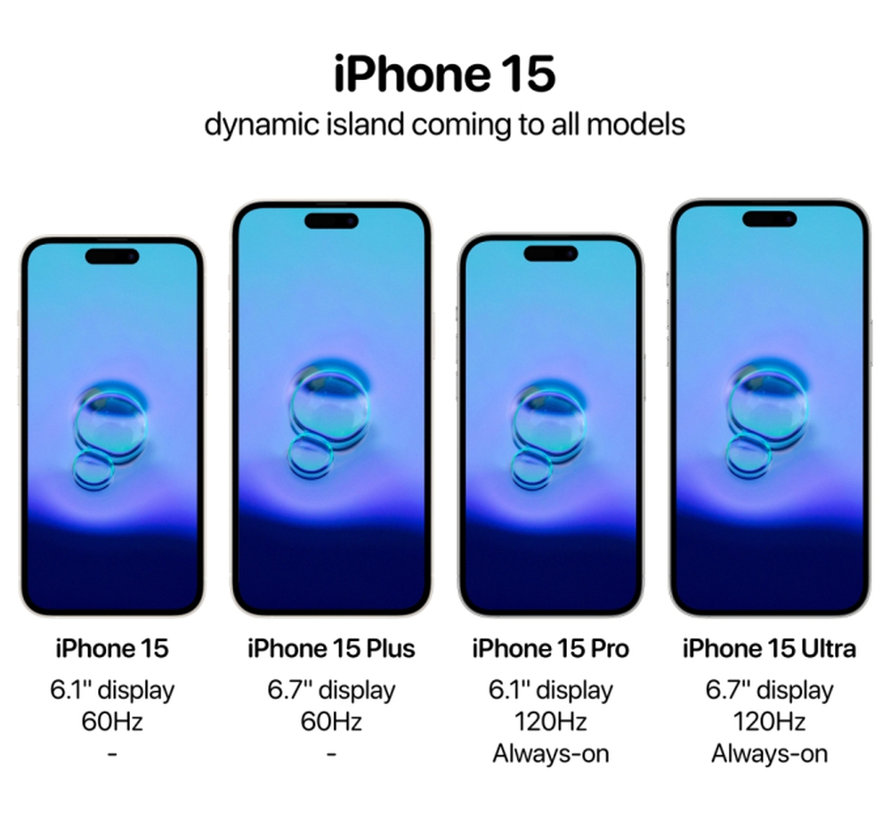 iPhone 15 tiêu chuẩn có thể sẽ có khả năng chống bụi và nước IP68 tương tự iPhone 14 Pro Max cũng như nhìn tổng thể khá giống nhau với Dynamic Island ở mặt trước và khối camera hình vuông ở mặt lưng.