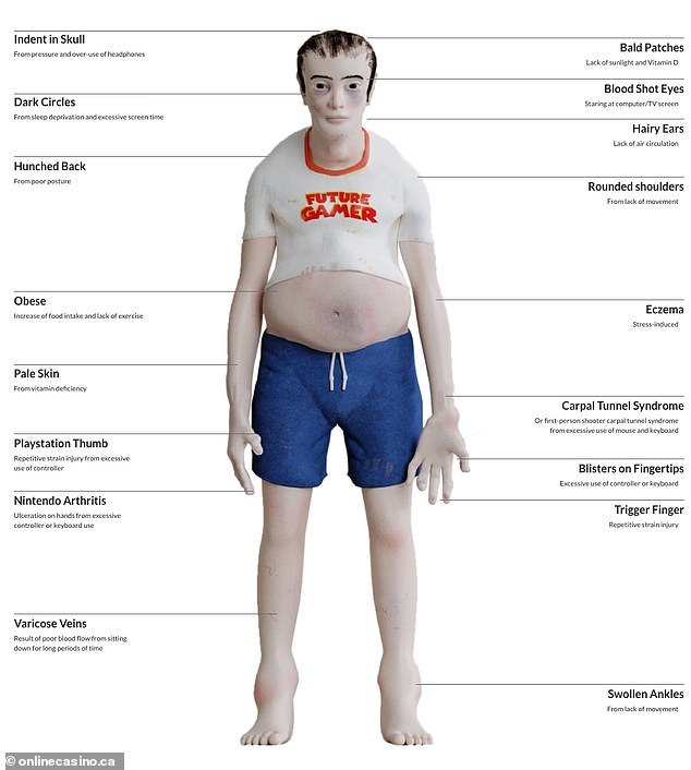 Bên cạnh đó, bài viết này cũng bao gồm một biểu đồ chỉ ra các tình trạng sức khỏe khác nhau liên quan đến chơi game quá lâu mà không có điểm dừng như thiếu vitamin, viêm khớp, mụn nước, mắt đỏ ngầu, vết lõm trong hộp sọ do áp lực và sử dụng quá mức tai nghe…