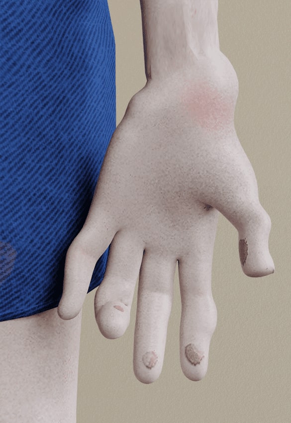- Ngón tay của người chơi game sẽ bị phồng rộp. Đây là tổn thương do các động tác lặp đi lặp lại như gõ bán phím hay nhấn bộ điều khiển. Móng tay sẽ bắt đầu bị lỏng ra khỏi giường móng, cơ bàn tay đau nhức và các mụn nước bắt đầu xuất hiện ở đầu ngón tay.