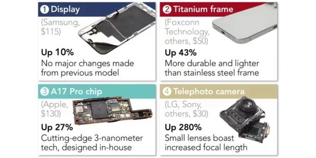 Có 3 phần khiến iPhone 15 Pro Max tăng giá so với iPhone 14 Pro Max: chipset A17 Pro, khung titan và camera tele 5x. Trong khi đó, giá bộ nhớ và màn hình lại giảm.